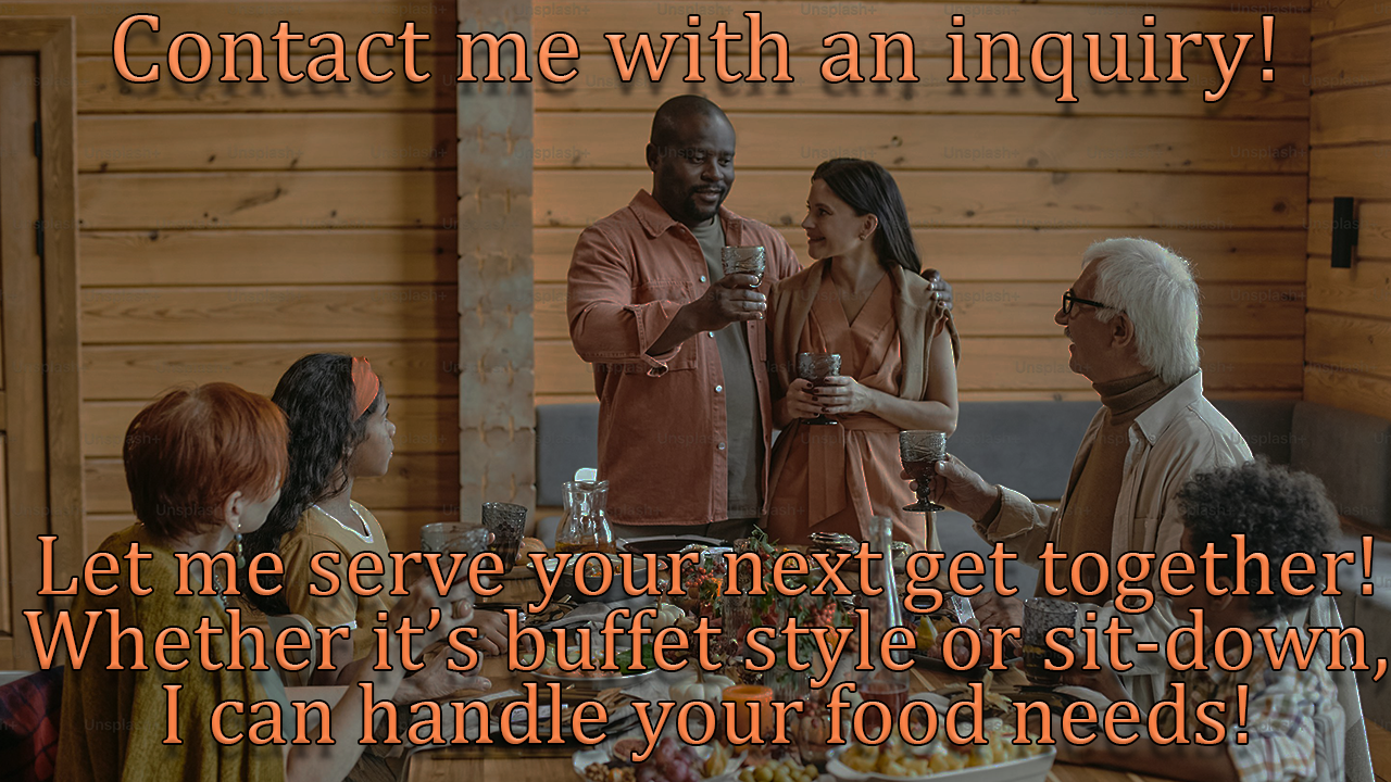 Have me handle the food for your get together! Buffet style or Sit down style, contact with an inquiry.